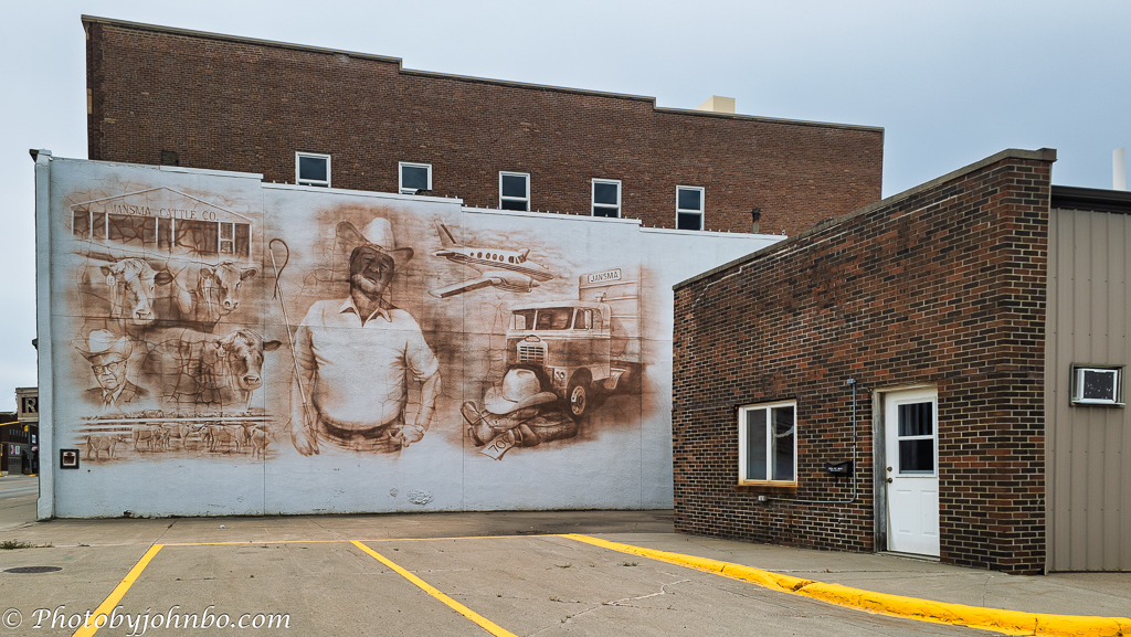 Last week’s Cellpic Sunday featured D.G. DeWaay, one of several people we saw depicted on murals during our recent trip to Rock Rapids. The city’s public art initiative honors local entrepreneurs and professionals. This week, we move just a few blocks away to the side of the Rock Rapids Theater, where another towering mural commands attention. The artwork honors a man whose empire was built on cattle, semis, and sale barns.