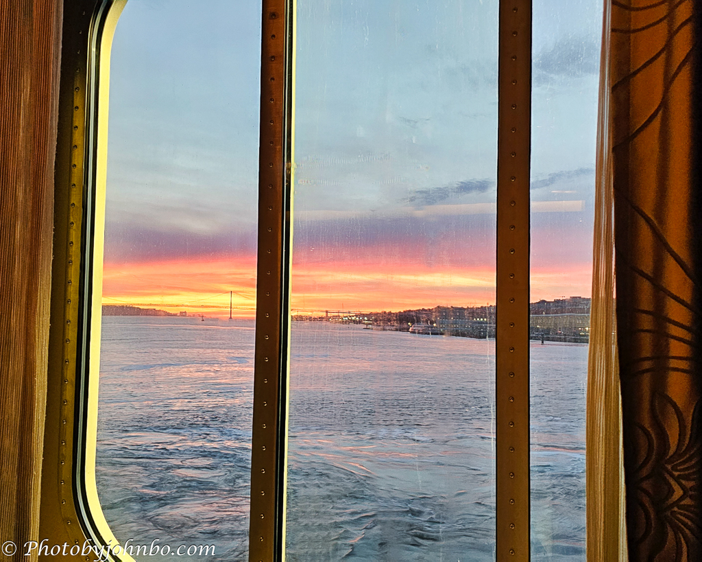It was dinnertime when we set sail from the port city of Lisbon. We sat down at the table, which happened to be next to a window. I was in a perfect position to capture the sunset. Spanning the Tagus River with its striking red steel and sweeping cables, the 25 de Abril Bridge is one of Lisbon’s iconic landmarks. Opened in 1966, it was modeled in many respects after the Golden Gate Bridge, though its engineering more closely resembles that of the Bay Bridge in the San Francisco area.