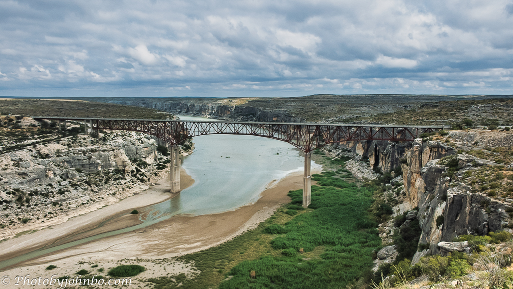 Today, the trains run high and straight, far above the canyon floor—but the land still tells stories. From this vantage point, the Pecos River winds southward through a rugged corridor of cliffs and scrub, eventually merging with the Rio Grande near the U.S.–Mexico border. The view stretches toward that distant confluence, where the river becomes a boundary, and the terrain grows even more remote.